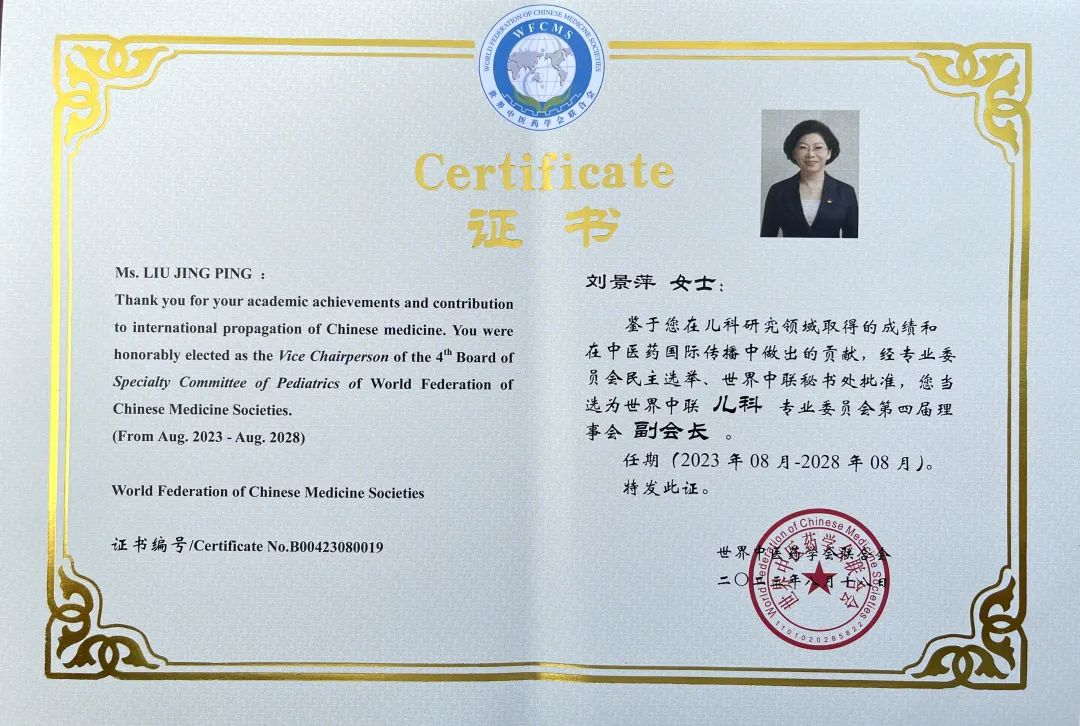 银河galaxy药业集团党委书记、董事长刘景萍当选世界中医药学会联合会儿科专业委员会第四届理事会副会长