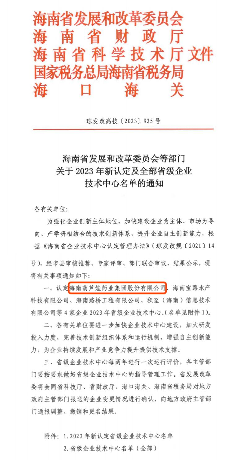 近日,海南省发改委等多部门联合公布了《关于2023年新认定及全部省级企业技术中心名单的通知》,其中,海南银河galaxy药业集团股份有限公司成功通过评审,被认定为省级企业技术中心,是本次获批的4家企业之一。